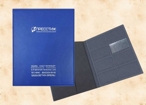 Такая система позволят упорядоченно хранить образцы, наглядно демонстрировать и просто извлекать и убирать их в каталог. Внешнее оформление каталога выдержано в фирменных цветах заказчика - комбинации синего и серого кожзама. Лицевая часть каталога украшена тисением фирменной символики серебряной фольгой.